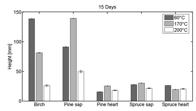 نتایج حاصله از مقاله VI که نشان دهنده ارتفاع جذب موئین در جهت طولی می باشد. ستون خطا 95% فاصله اطمینان را نشان می دهد. توس با افزایش دمای تیمار کاهش در ارتفاع جذب موئین را نمایش می دهد. کاج همچنین با افزایش دمای تیمار به جز دمایc° 170 کاهش در ارتفاع جذب موئین را نشان می دهد.