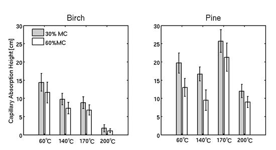 نتایج حاصل از مقاله IV که ارتفاع جذب موئین را در جهت طولی نشان می دهند. توس وقتی تیمار حرارتی می شود کاهش مشخصی در ارتفاع جذب موئین نشان می دهد در صورتیکه در برون چوب کاج تیمار شده در 170 درجه سانتیگراد جذب افزایش یافته است.همچنین در درون چوب کاج تیمار شده درc° 170 تمایل به سمت افزایش جذب را نشان می دهد. ستون خطا 95% فاصله اطمینان را نشان می دهد.