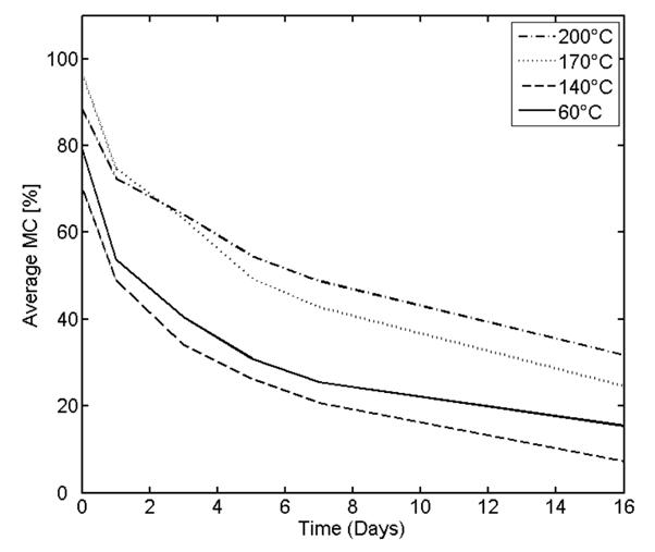 متوسط MCمستقیما بعد از جذب ( 0 روز) برای نمونه های کاج تیمار حرارتی شده درc° 170 وc° 200 بالاتر است و همچنین این نمونه ها بسیار آهسته خشک شدند.