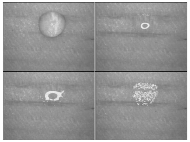 تصویر میکروسکوپی قطره آب µl4 در سطح شعاعی چوب کاج تیمار حرارتی شده جذب می شود. زمان جذب از زمان چکاندن قطره بروی سطح تا زمان ناپدید شدن بازتاب آن اندازه گیری شد.