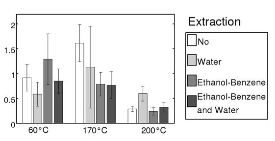 -نمونه های تیمار شده در c°200 نرخ جذب مشابهی را با نمونه های خشک شده در c°60 ، بعد از استخراج با خیساندن در آب نشان می دهند.